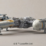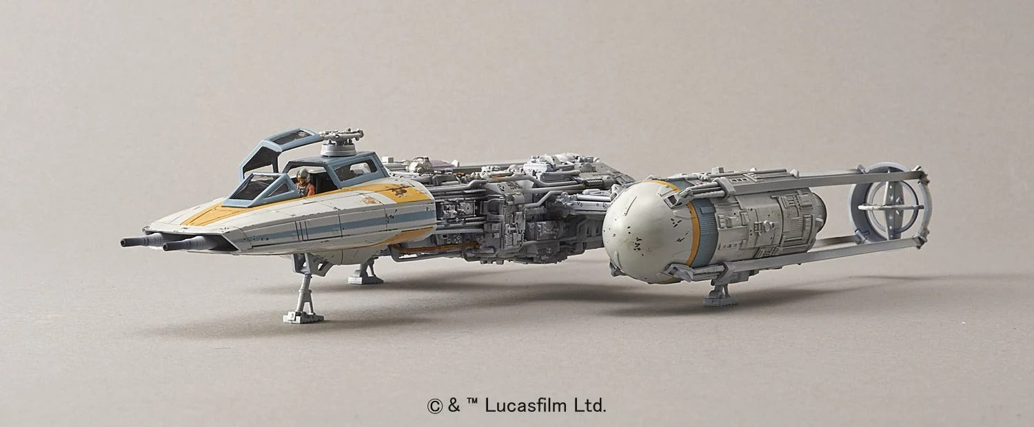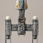 The Y-Wing Starfighter comes with two sitting pilots, one standing pilot, an R5 style Astromech Droid, and an R2 style Astromech Droid. The canopy of the ship can also open up. This model kit comes with some pre painted pieces, but additional paint will need to be applied for weathering affect and other details.