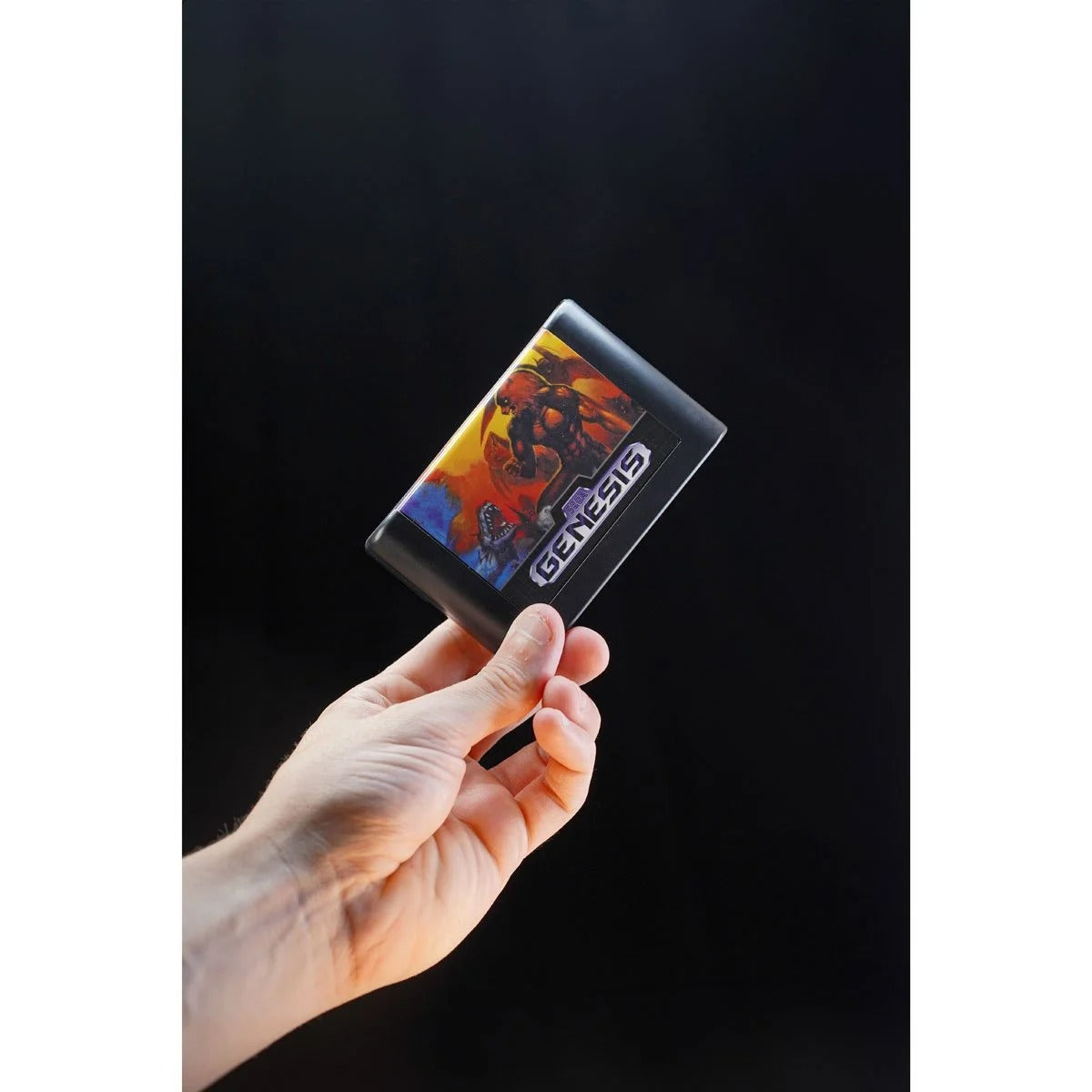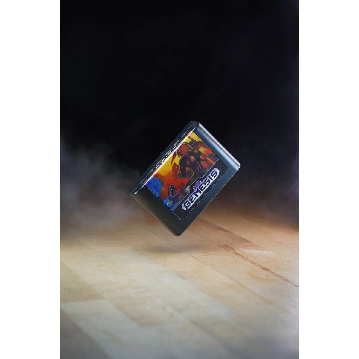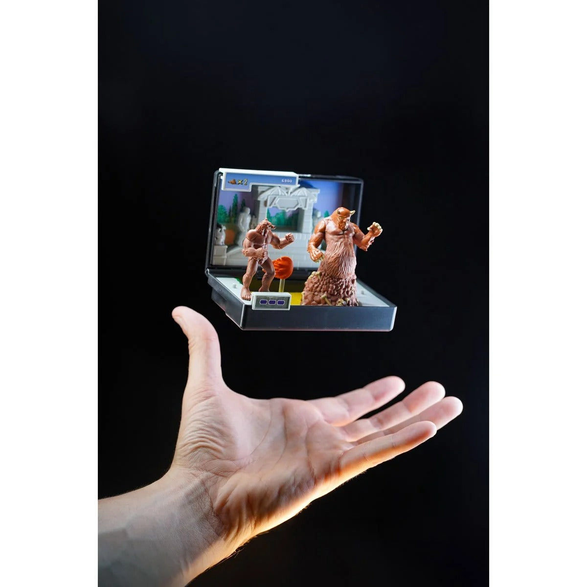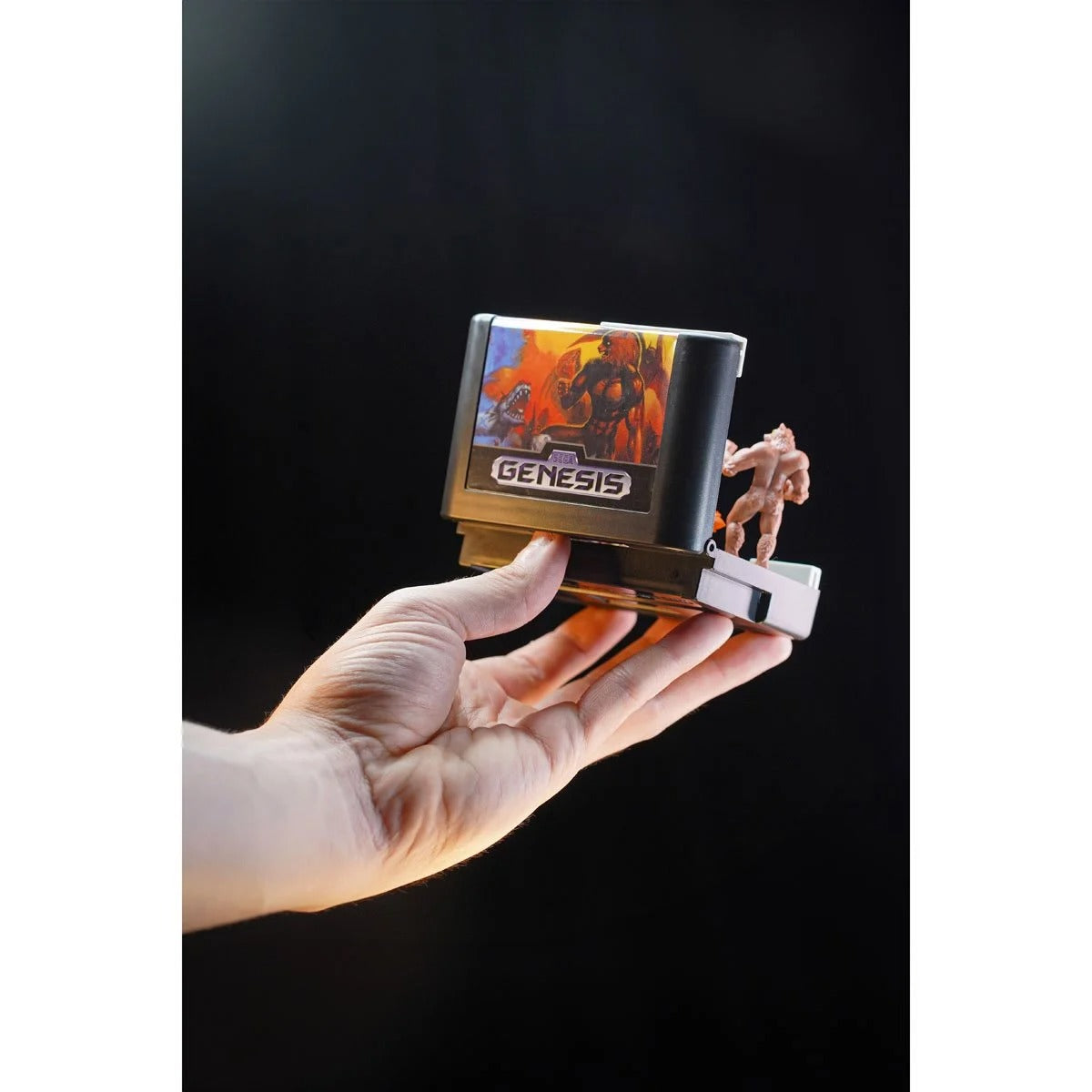Console Heroes Altered Beast brings the legendary graveyard boss battle to life in a detailed collectible diorama. This set features a mini scene built into a plastic Sega Genesis game cartridge that folds open to reveal a sculpted stage inspired by the game's first boss fight. It includes two mini-figures: the Werewolf (1 1/2-inches tall) and the oversized Aggar boss, each with peggable bases for display. The diorama features a molded graveyard with bone and statue detailing, a flame blast effect on a clear stand, and a printed backdrop with the iconic statues and HUD. The cartridge folds shut for compact display. The figures are designed for external display and do not store inside. Perfect for collectors and fans of retro Sega classics. For ages 8 and up.