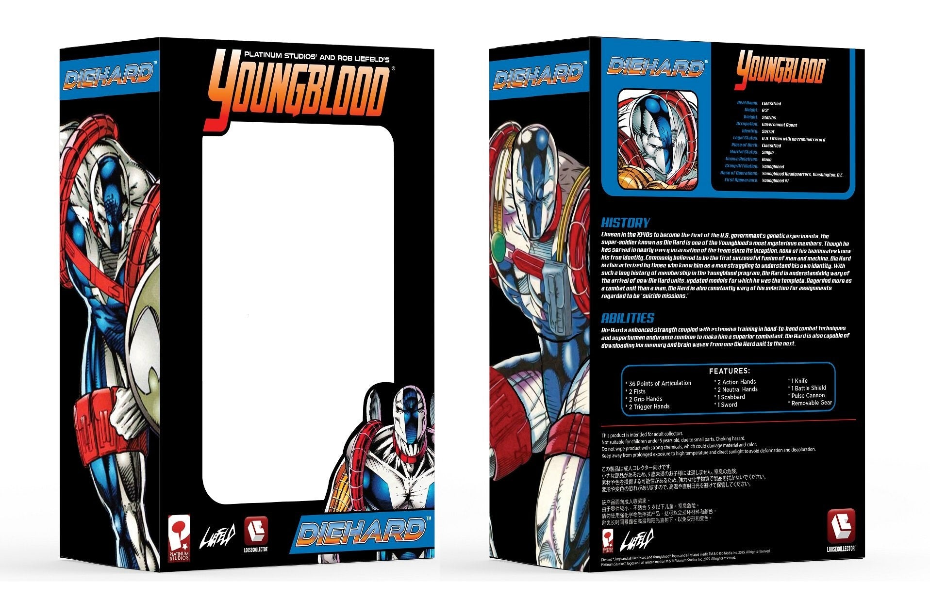 Chosen in the 1940s to become the first of the U.S. government’s genetic experiments, the super-soldier known as Die Hard is one of the Youngblood’s most mysterious members. Though he has served in nearly every incarnation of the team since its inception, none of his teammates know his true identity. Commonly believed to be the first successful fusion of man and machine, Die Hard is characterized by those who know him as a man struggling to understand his own identity. With such a long history of membership in the Youngblood program, Die Hard is understandably wary of the arrival of new Die Hard units, updated models for which he was the template. Regarded more as a combat unit than a man, Die Hard is also constantly wary of his selection for assignments regarded to be “suicide missions.”