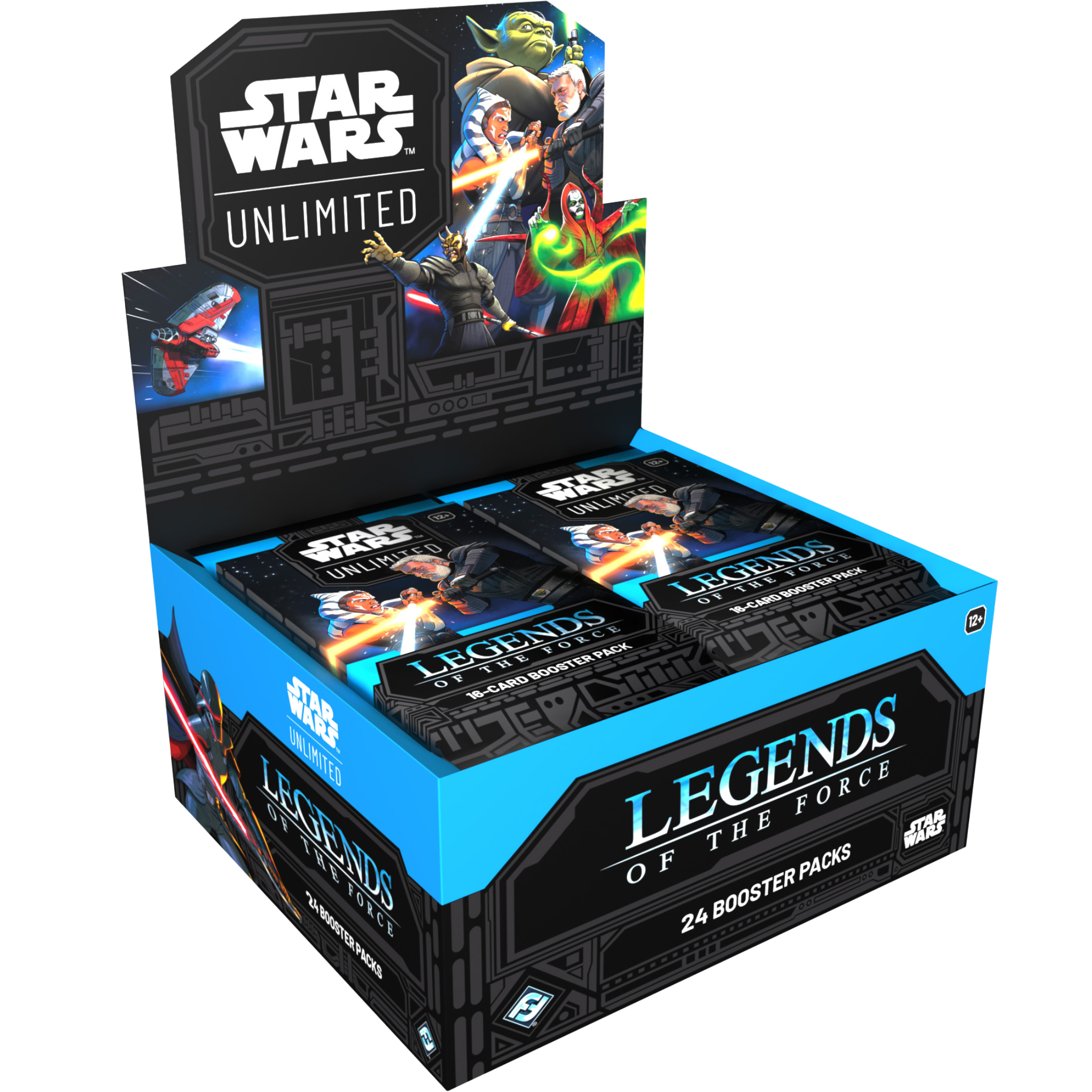 In this booster pack display for the game’s fifth set, Legends of the Force, players will find 24 individually wrapped booster packs. Each pack contains 9 common cards, 3 uncommon cards, 1 rare or legendary card, 1 leader, 1 base/token, and 1 foil card.