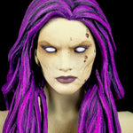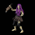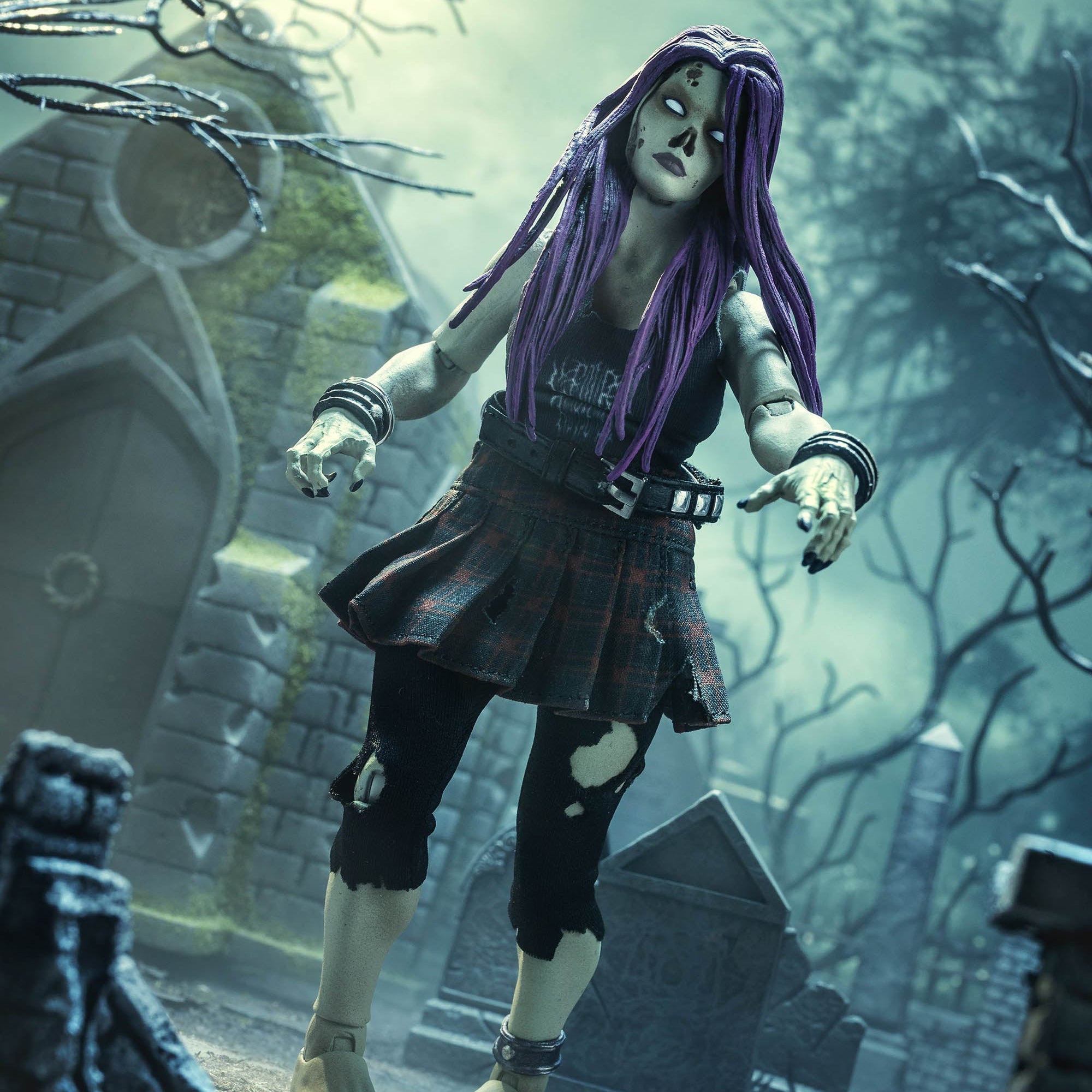 The Rocker Zombie figure comes with a fully posable base body with soft goods plaid skirt, studded belt, torn leggings, and a t-shirt with Four Horsemen death metal logo on it! She also includes extra hands, a skeleton lower arms (can be used as a weapon or popped into her lower arm), a pair of rats, plus 2 different heads - 1 of which can use either the purple hair or the black and red hair.