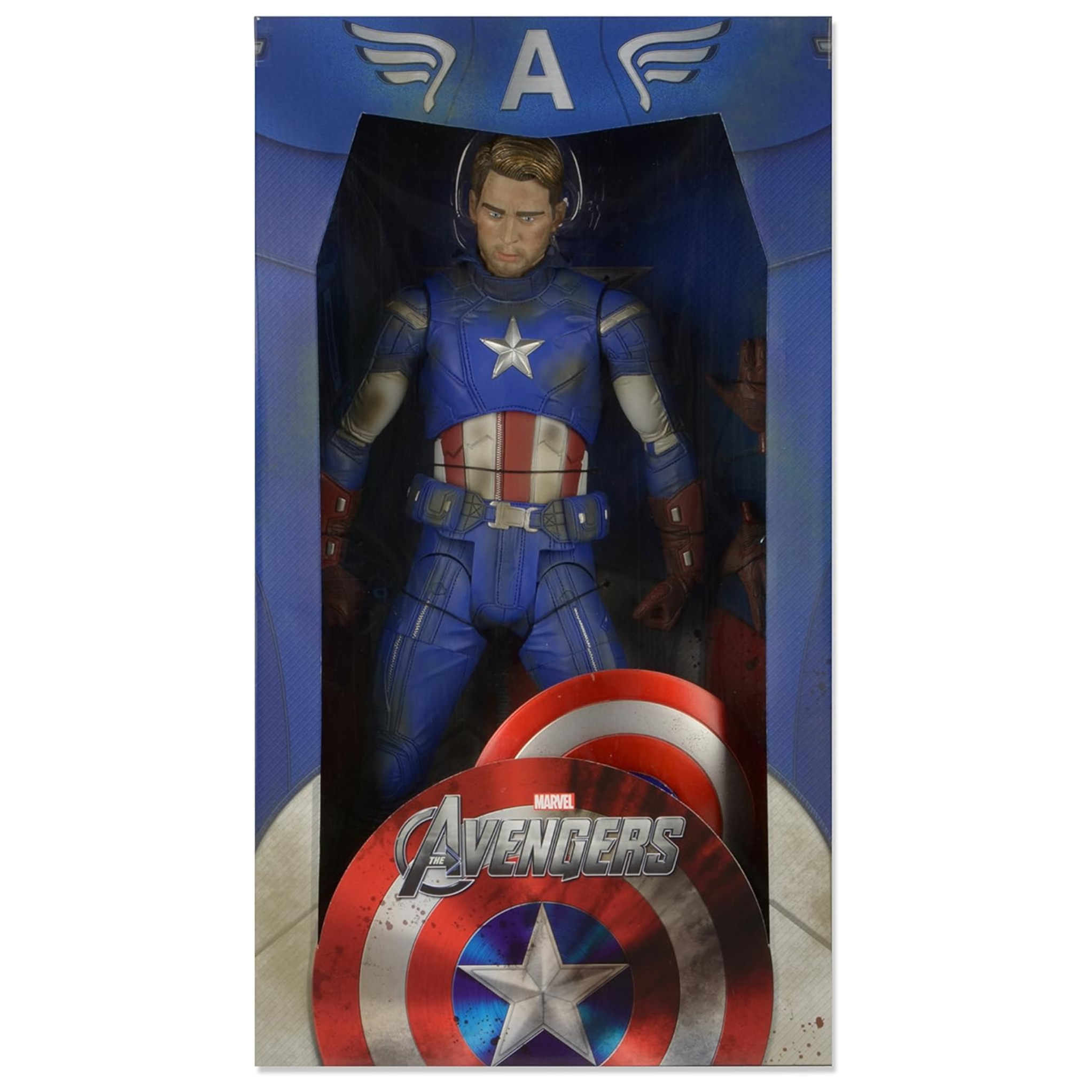 A battle-damaged version of the First Avenger comes to your collection! Based on his appearance in the blockbuster movie The Avengers, Captain America stands approximately 18-inches tall and features an unmasked head sculpt featuring the likeness of Chris Evans, plus a deco showing damage from the battle for New York City. The truly incredible degree of detail on this poseable action figure includes over 25 points of articulation, including neck, shoulders, torso, elbows, hips, knees, wrists, and more!