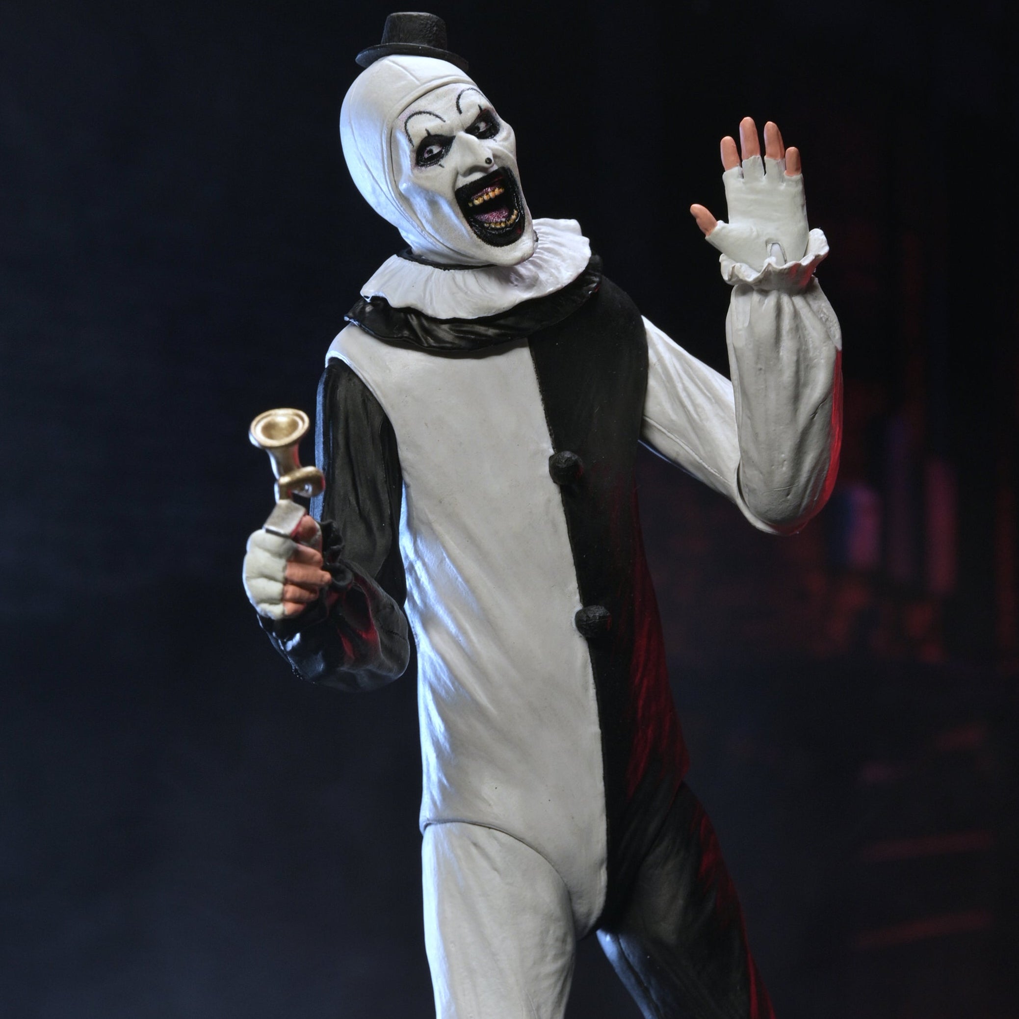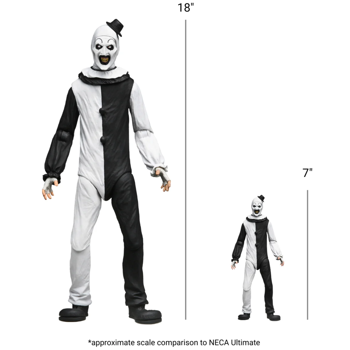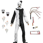 From Damien Leone’s hit Terrifier films comes the iconic Art the Clown, now joining NECA’s line of quarter-scale horror figures! Standing over 18 inches tall, this fully articulated Art the Clown captures the nightmarish essence of the new horror icon with chilling accuracy. Art comes equipped with a gruesome arsenal of bloody weapons and accessories, including a kitchen knife, clown horn, hacksaw, and flail. Customize the mayhem with interchangeable hands and faceplates, each depicting a different maniacal expression to bring his disturbing personality to life. Presented in collector-friendly window box packaging, this figure is a must-have centerpiece for any horror fan’s collection!