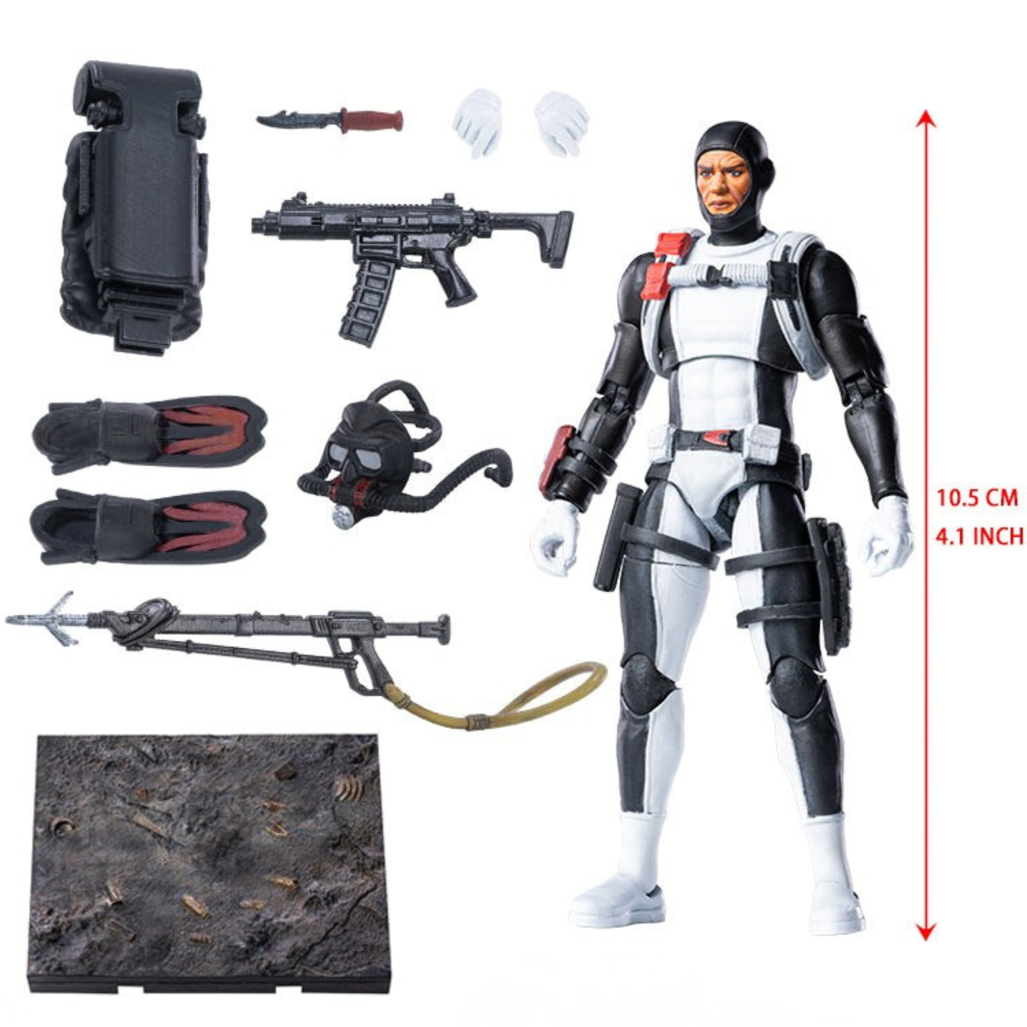 This brand-new Torpedo action figure stands at 10.5CM in height. Based on the original appearance of the G.I. Joe. He equipped with professional underwater combat gear, featuring a black-and-white one-piece diving suit complemented by a wrist-mounted dive computer, shoulder pouches and scabbard, combining modern style with practical functionality for combat.