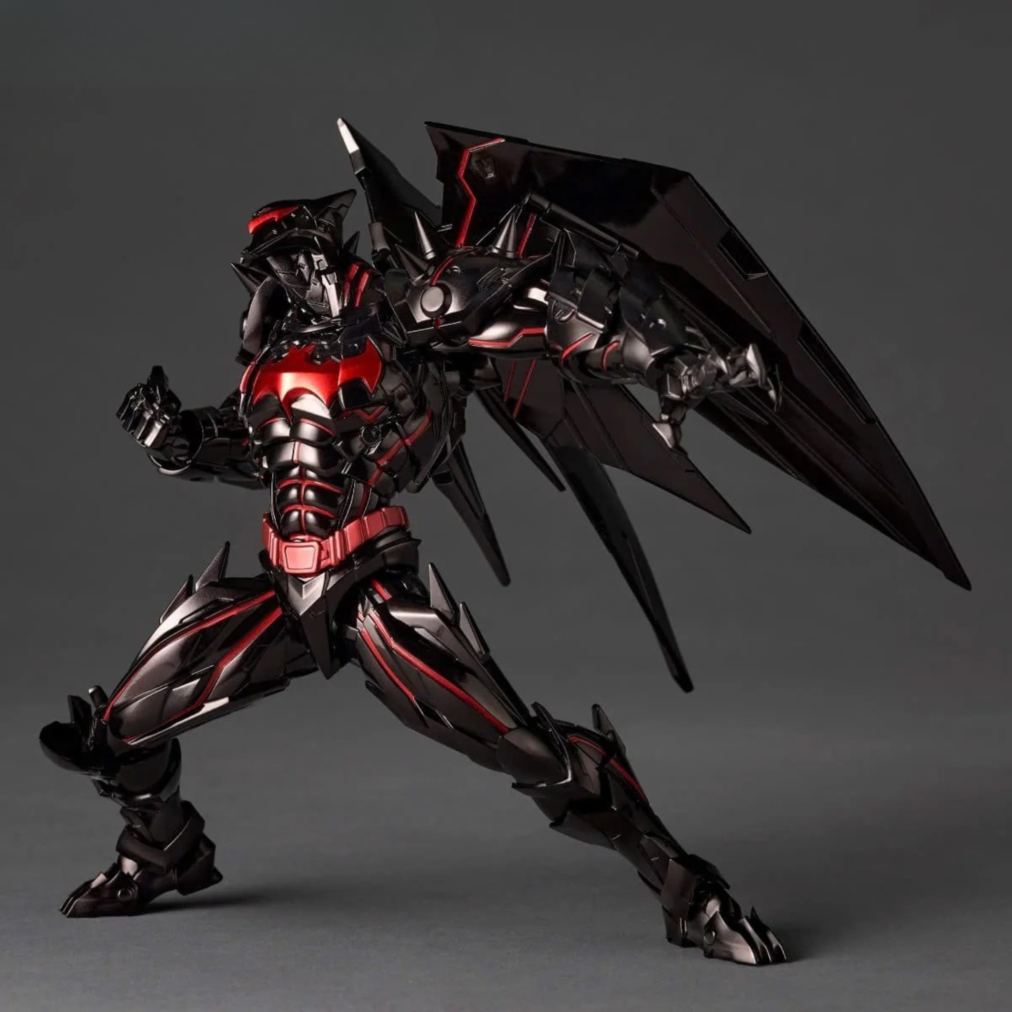 Batman in the "Hellbat" suit, created to battle Darkseid, the DC Universe's most powerful enemy, joins the Amazing Yamaguchi line! The armor, forged by the Justice League through the combined powers of their special abilities, features a deep, glossy black finish with metallic red accents representing the energy emanating from within.