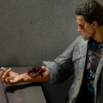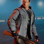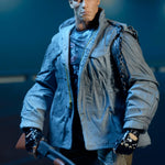 The Ultimate Tech Noir T-800 features that punk outfit with metal jacket chain and bears the likeness of Arnold Schwarzenegger. The deluxe 7” scale figure has over 25 points of articulation, plus 3 interchangeable heads, interchangeable right forearm, alternate hand, a small arsenal of weaponry, and two surgical tools for post-battle repairs.