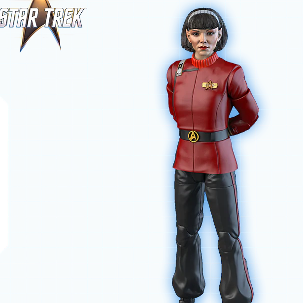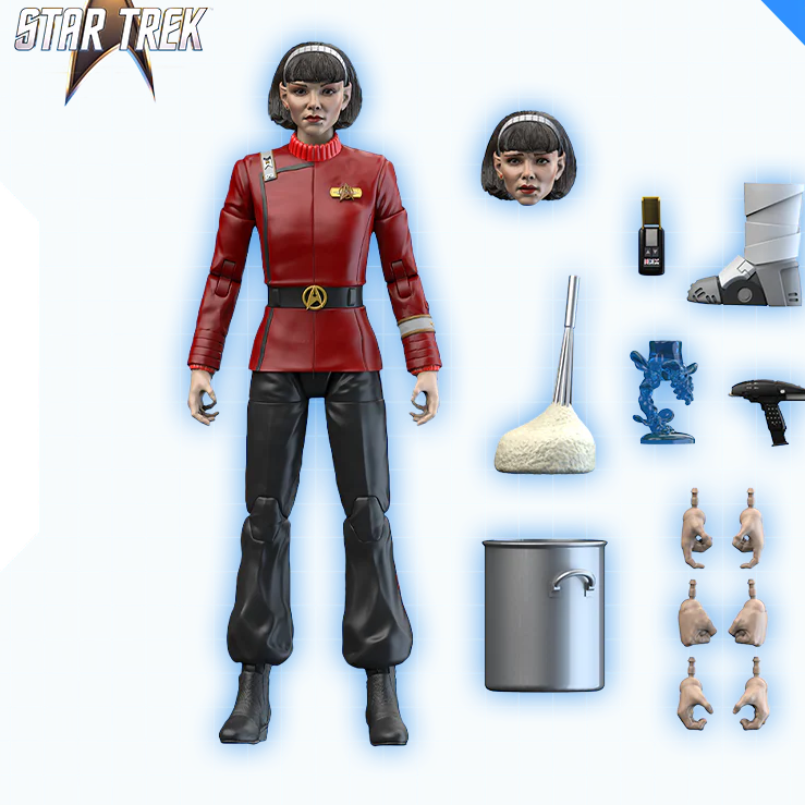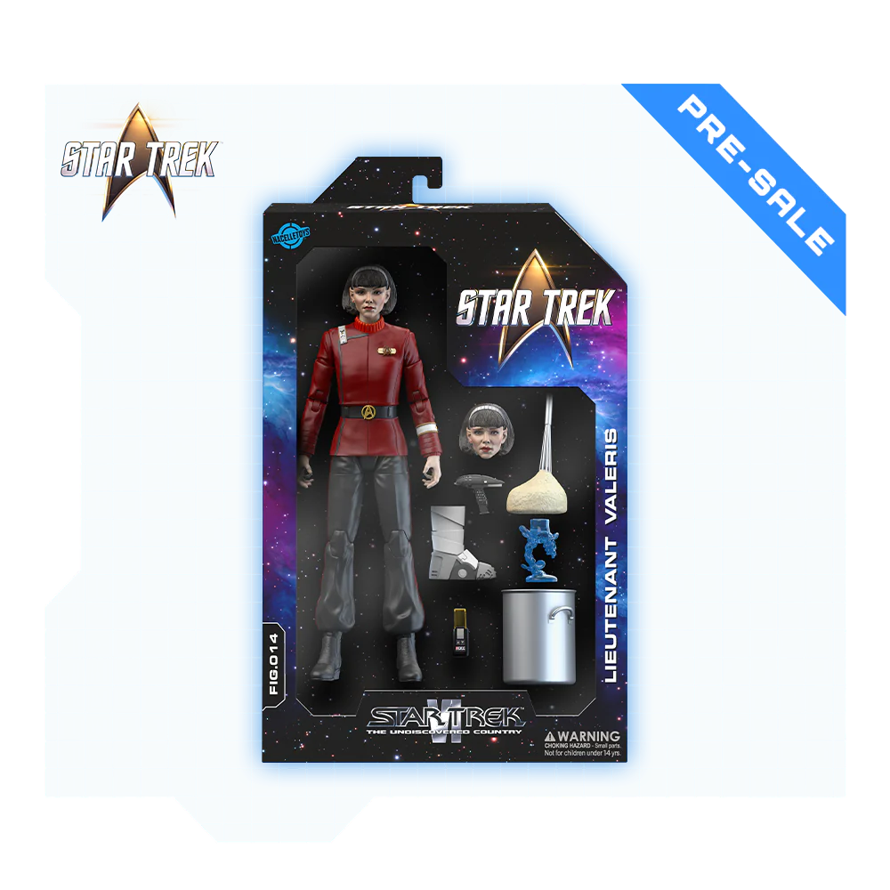 At the end of history lies the undiscovered country — where traitorous Lieutenant Valeris is waiting for you! Captain Spock’s young Vulcan protégé arrives as an articulated 1/10-scale action figure, complete with several artifacts from her mission on the U.S.S. Enterprise-A: a Starfleet phaser and communicator, the ornate Vulcan goblet from Spock’s quarters, an incriminating gravity boot used in the assassination of Klingon Chancellor Gorkon… and of course, a pot of mashed potatoes for target practice.