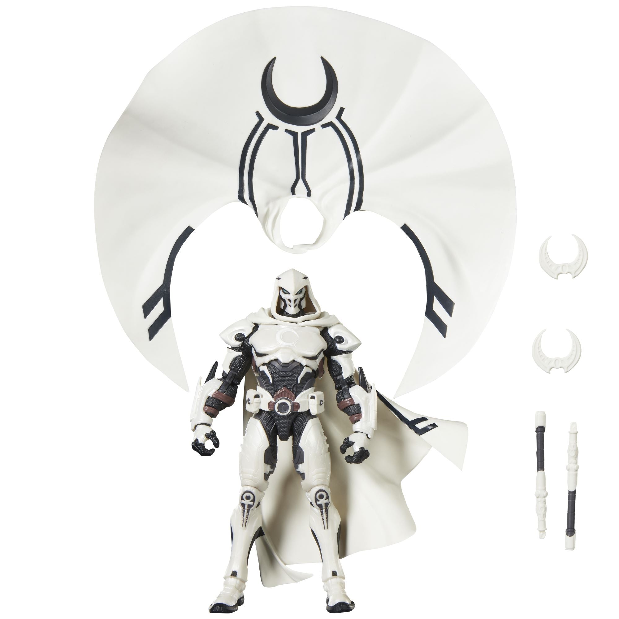 - GAMING-INSPIRED ACCESSORIES: Hasbro Marvel Legends action figure come with 5 accessories including 2 crescent darts, 2 billy clubs and an alternate moon-shaped cape