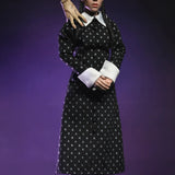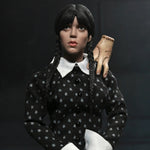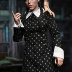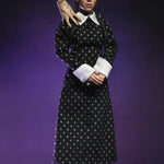 Smart, sarcastic, and a little dead inside, Wednesday Addams finds herself expelled and transferred to Nevermore Academy, a private school for monstrous outcasts. As she adjusts to her strange new environment, she faces murder mysteries, secret societies, local normies, and—worst of all—bright colors. Wearing her classic dress, this fully poseable 8-inch figure features tailored soft goods clothing inspired by vintage toy lines.