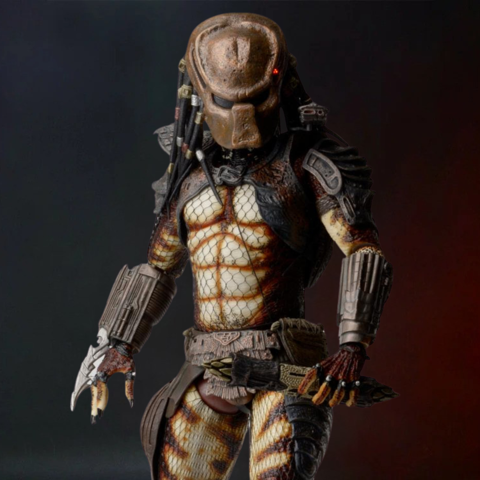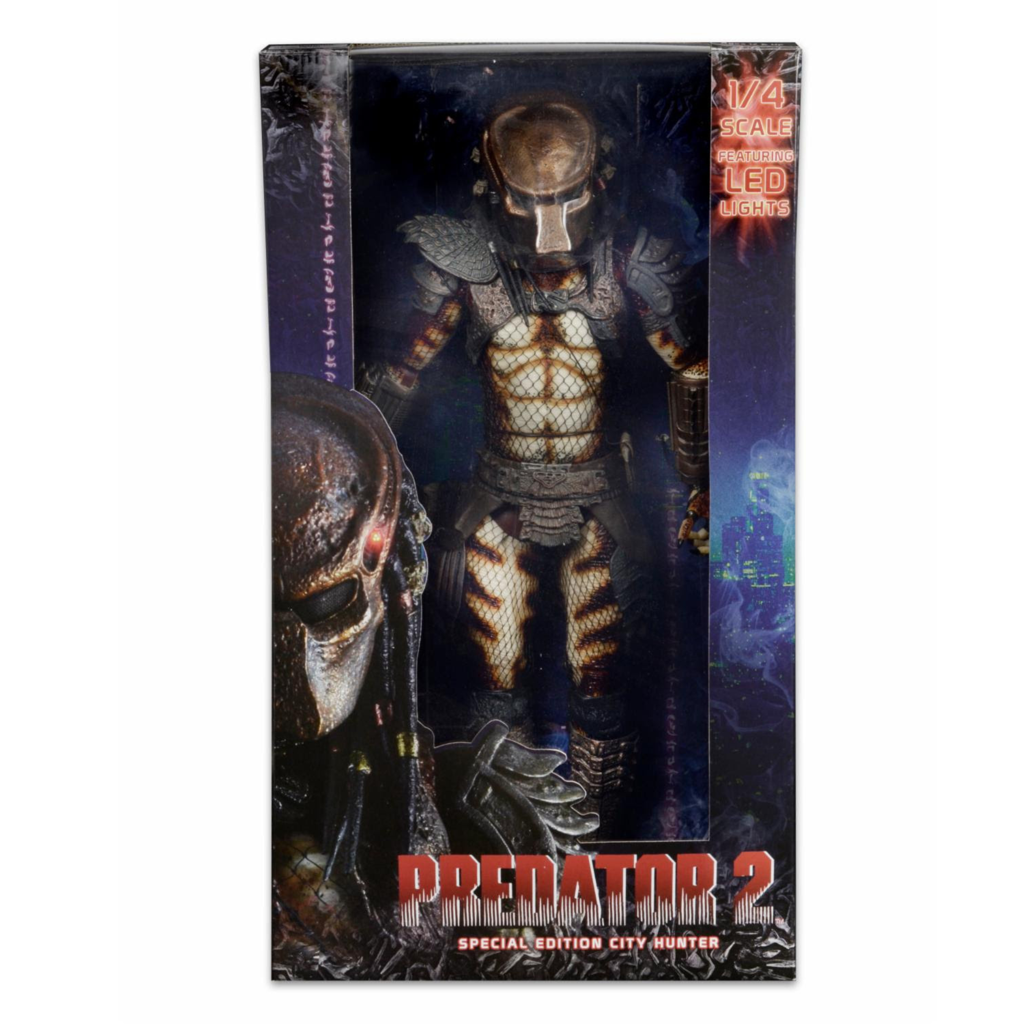 The action-packed sequel to the original movie moved the hunt to Los Angeles, where the Predator stalks his prey with deadly precision in a concrete jungle. Long out of production, the 1/4 scale City Hunter Predator has been updated to include LED lights in the mask’s targeting system and a new left forearm gauntlet that flips open.