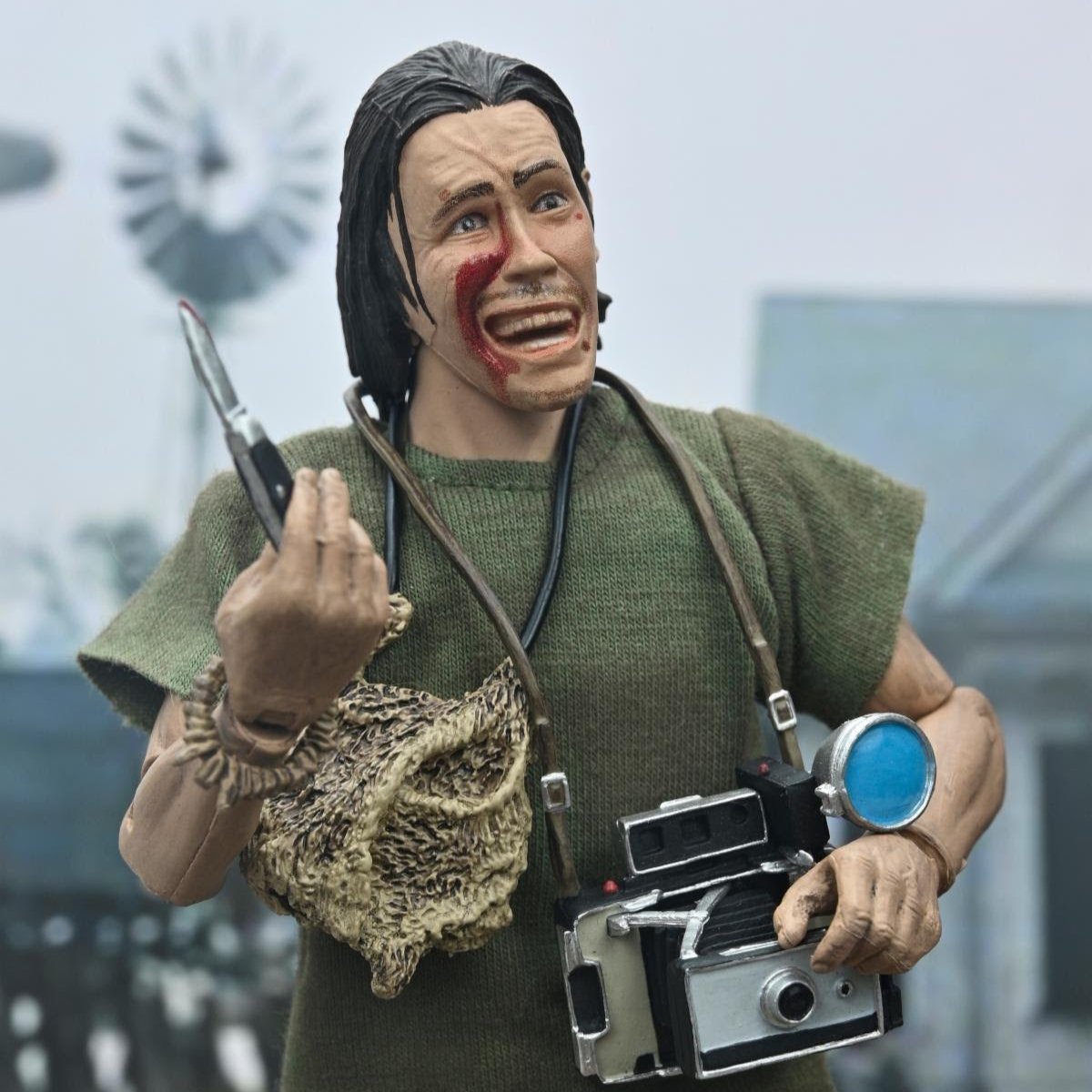 This anniversary edition figure of Nubbins Sawyer, the murderous cannibal, grave robber, and brother of Leatherface, is dressed in tailored fabric clothing similar to the retro toy lines that helped define the licensed action figure market in the 1970s. The fully poseable 8-inch figure includes camera, satchel, and straight razor accessories.