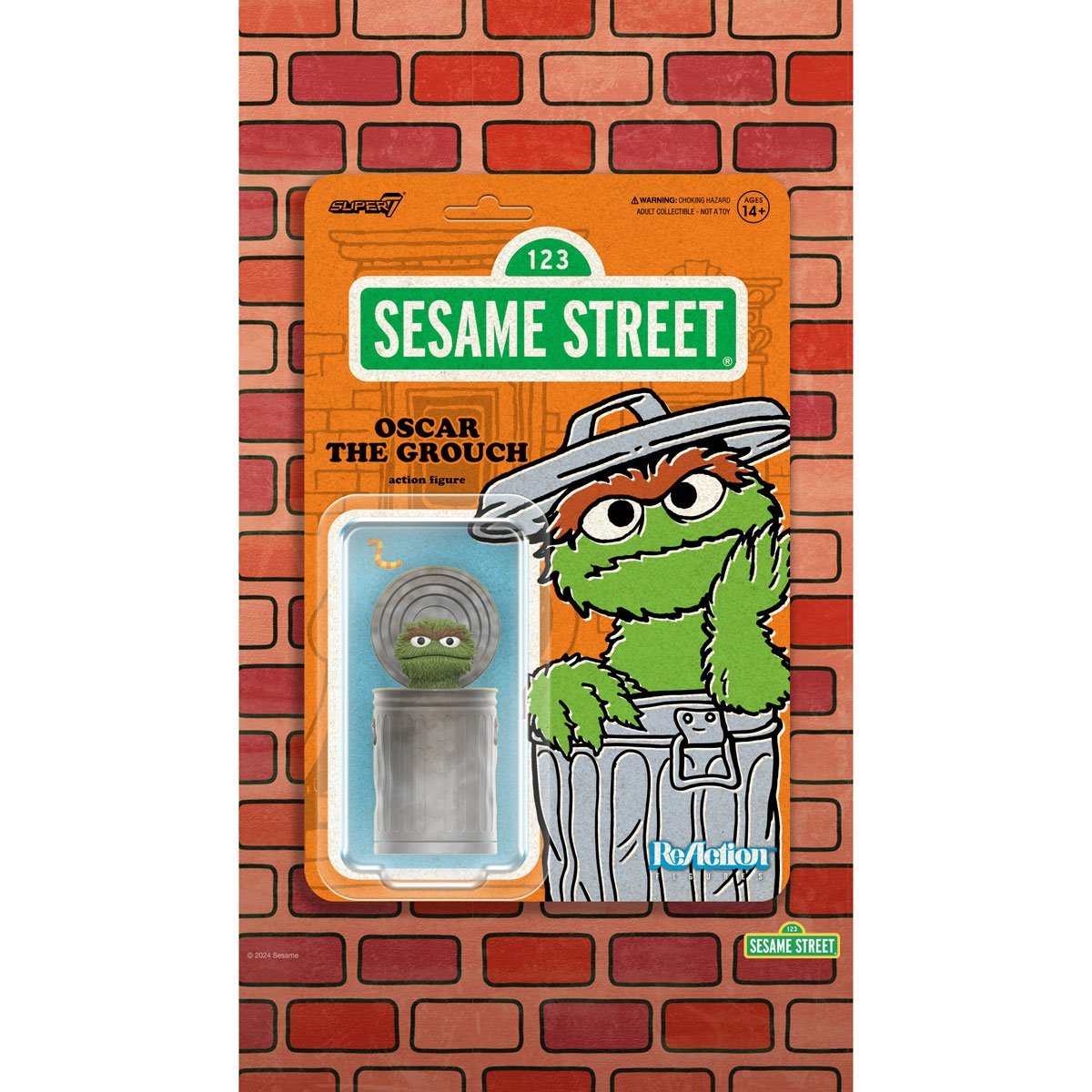 Oh, I love trash! Bring home a childhood classic with this Sesame Street Oscar the Grouch 3 3/4-Inch ReAction Figure! The puppets never looked better and now they can interact with your classic 3 3/4-inch action figure collection. Each figure comes packaged on a 6-inch by 9-inch cardback.